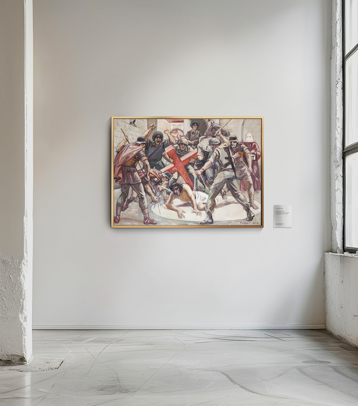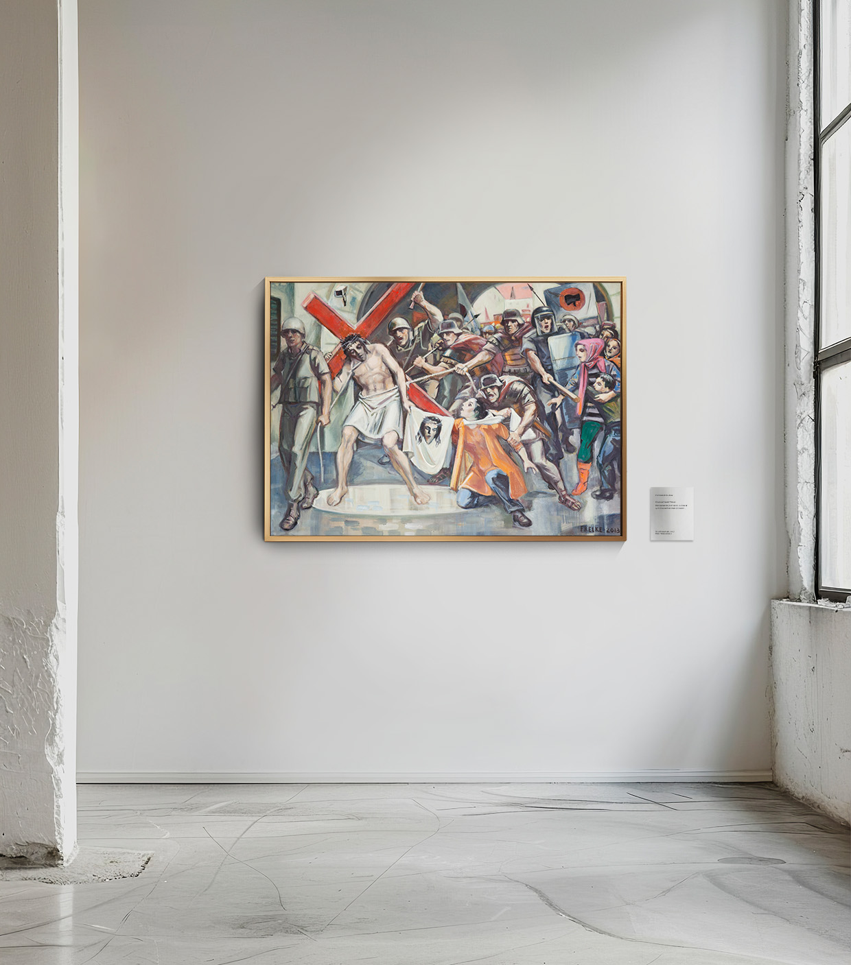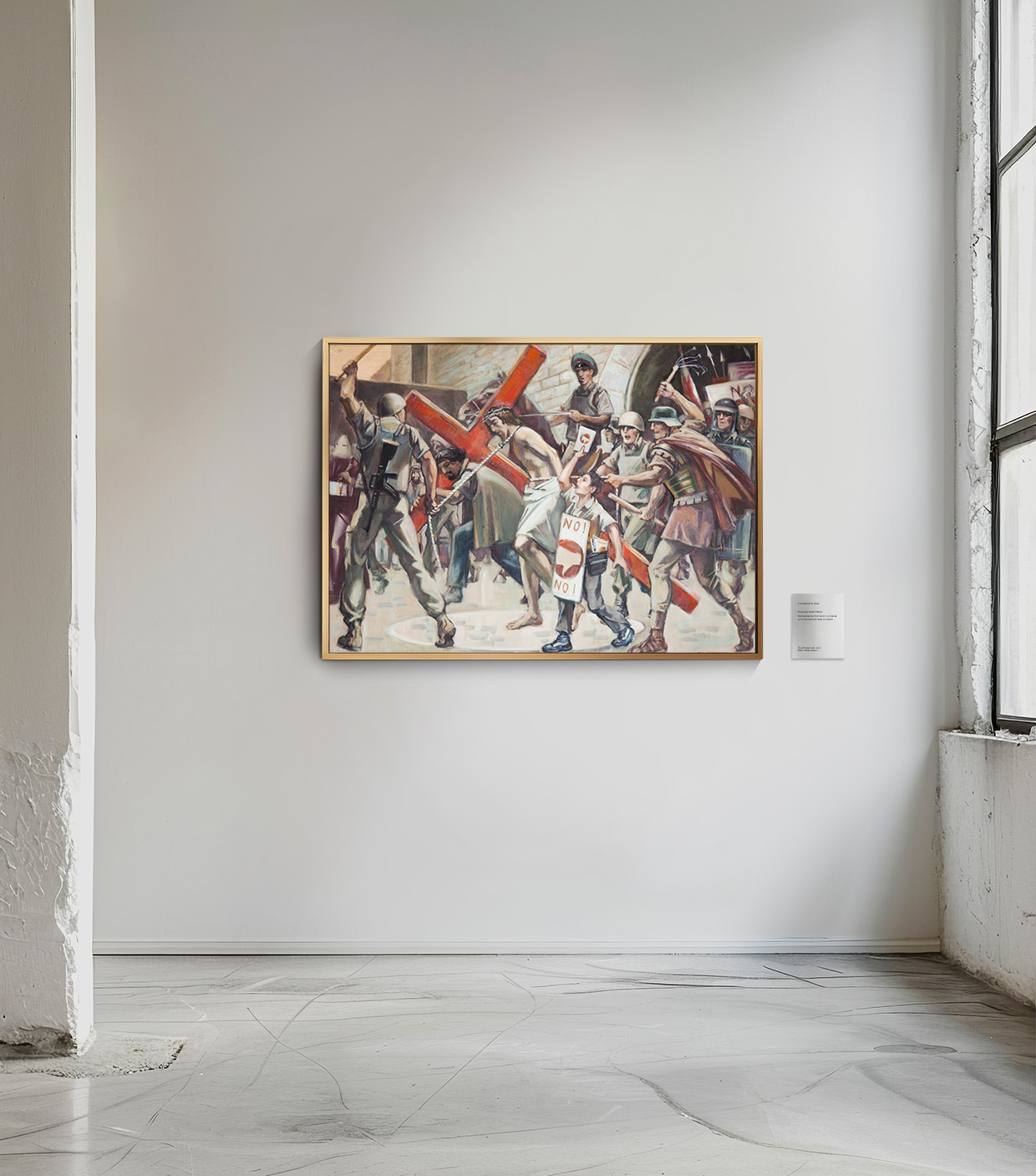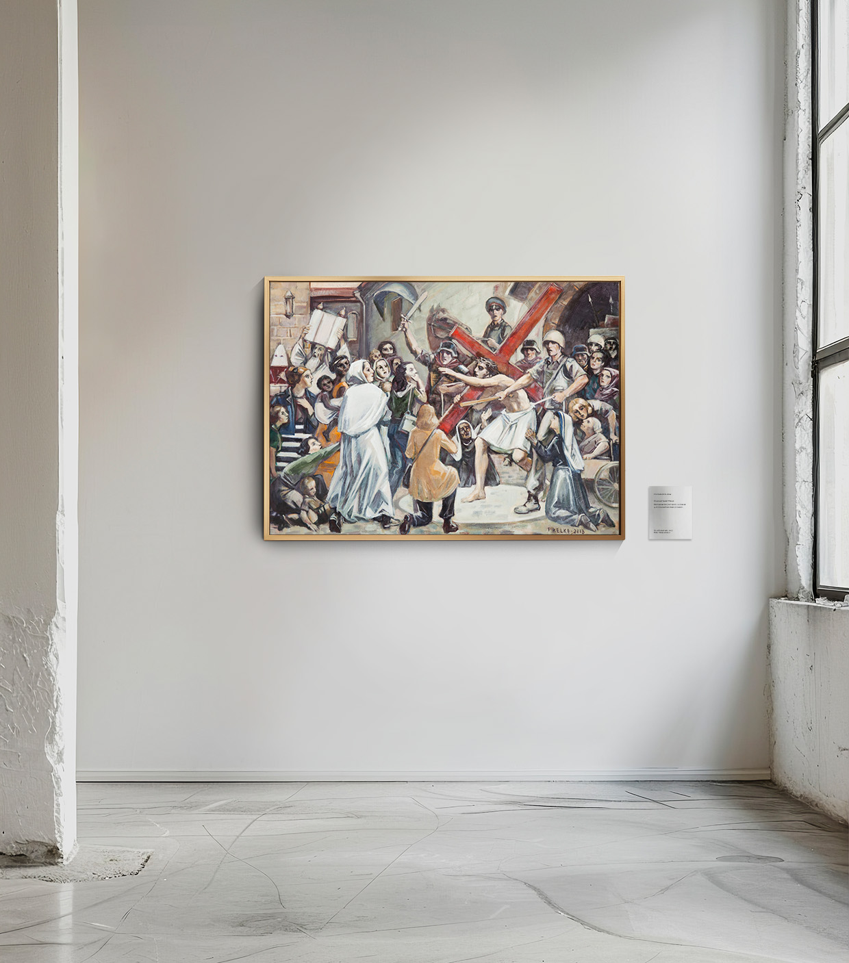 Helmut Frelkes Werke verbinden biblische Motive mit aktuellen gesellschaftlichen Themen und zeigen, wie universell und zeitlos der Leidensweg Christi ist. In urbanen Szenarien und modernen Symbolen spiegelt sich das Leiden der Menschheit wider, während das Antlitz Christi inmitten der heutigen Herausforderungen Hoffnung und Stärke ausstrahlt. Frelkes Interpretation lädt den Betrachter ein, über die Relevanz von Glaube, Mitgefühl und Erlösung in der modernen Welt nachzudenken.