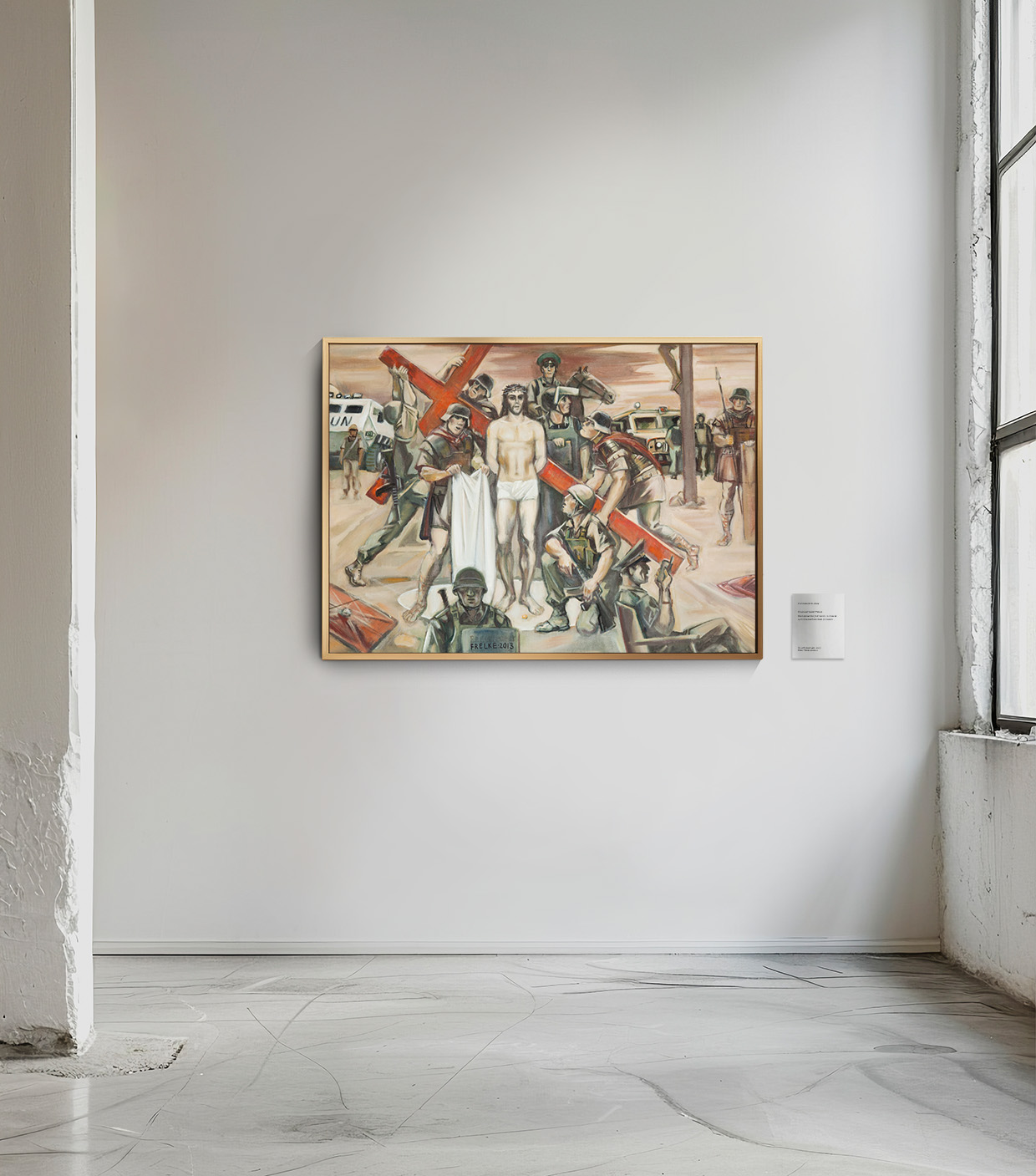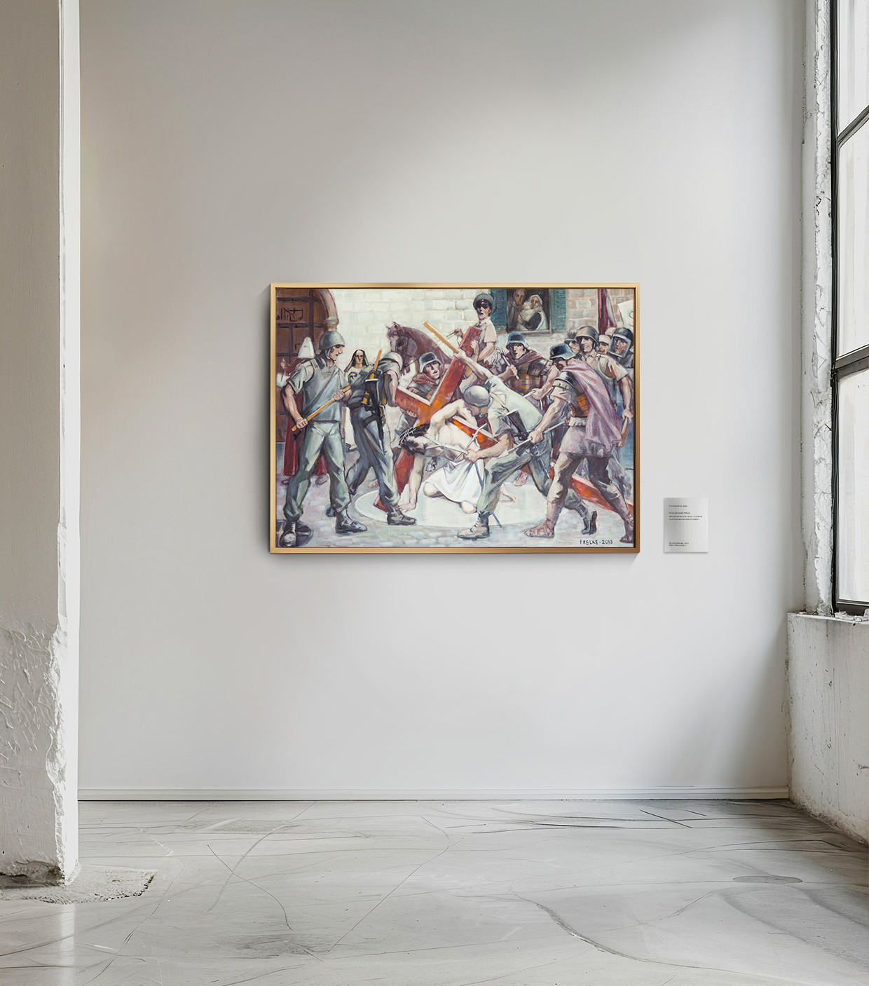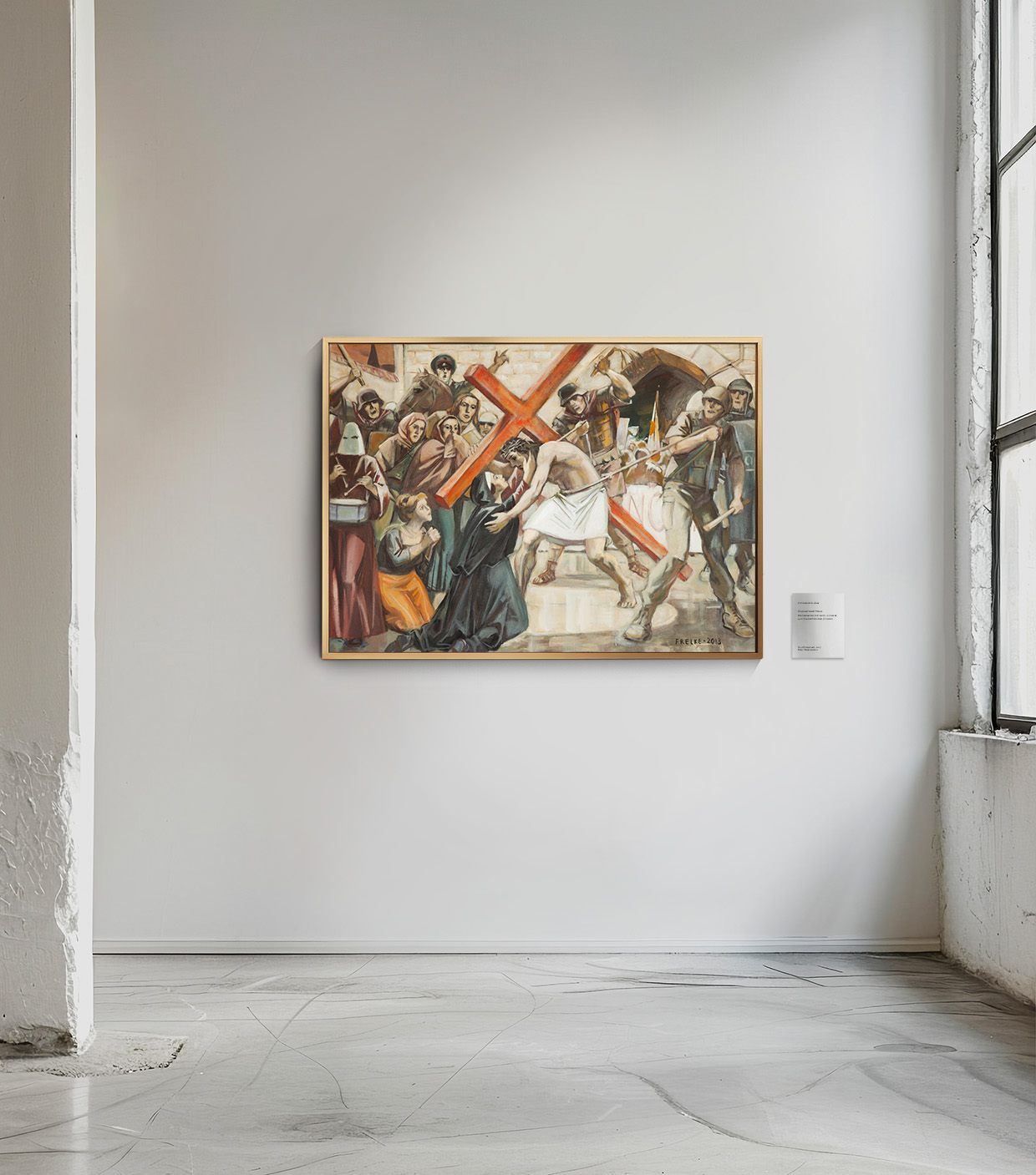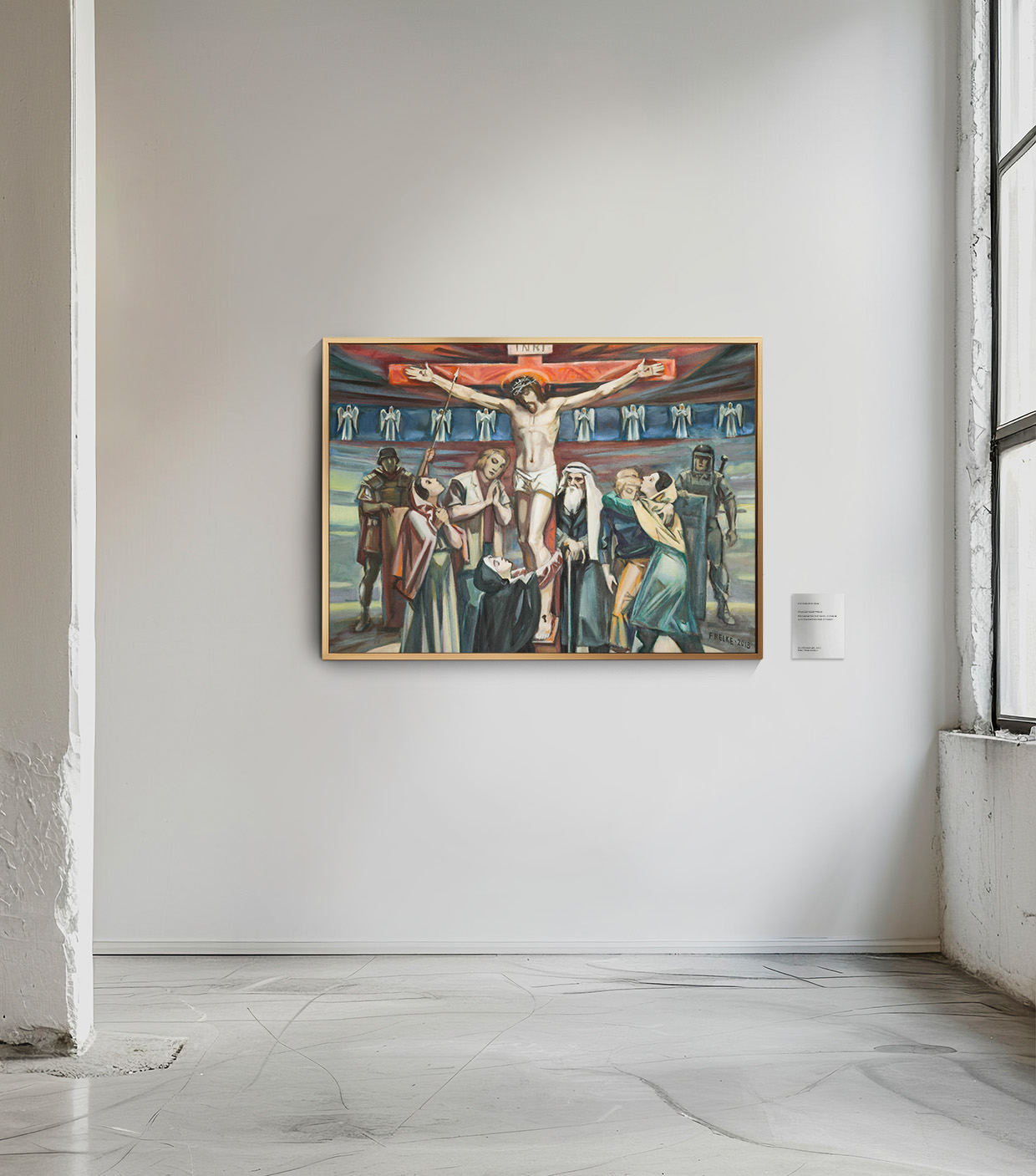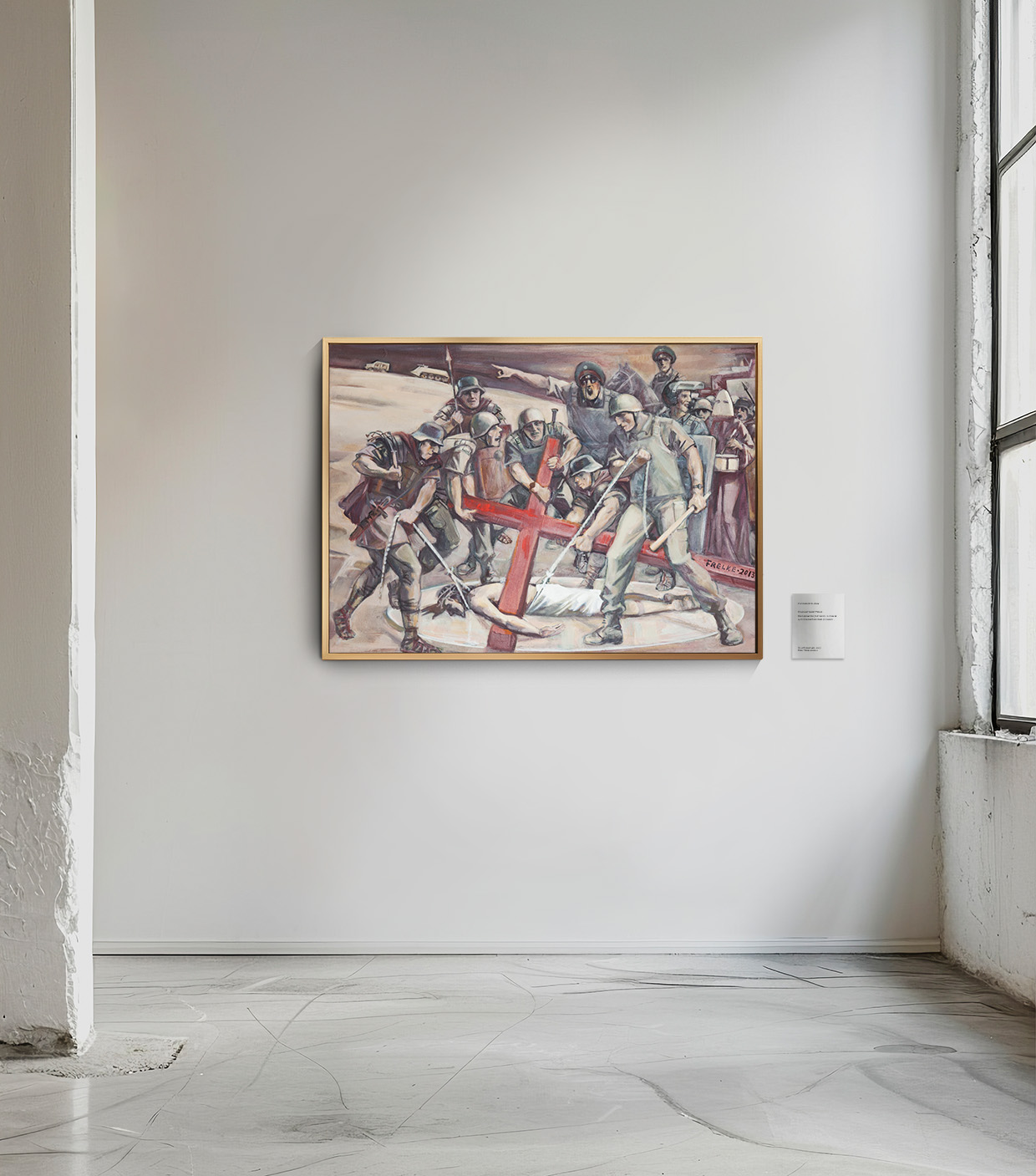 Helmut Frelkes Werke verbinden biblische Motive mit aktuellen gesellschaftlichen Themen und zeigen, wie universell und zeitlos der Leidensweg Christi ist. In urbanen Szenarien und modernen Symbolen spiegelt sich das Leiden der Menschheit wider, während das Antlitz Christi inmitten der heutigen Herausforderungen Hoffnung und Stärke ausstrahlt. Frelkes Interpretation lädt den Betrachter ein, über die Relevanz von Glaube, Mitgefühl und Erlösung in der modernen Welt nachzudenken.