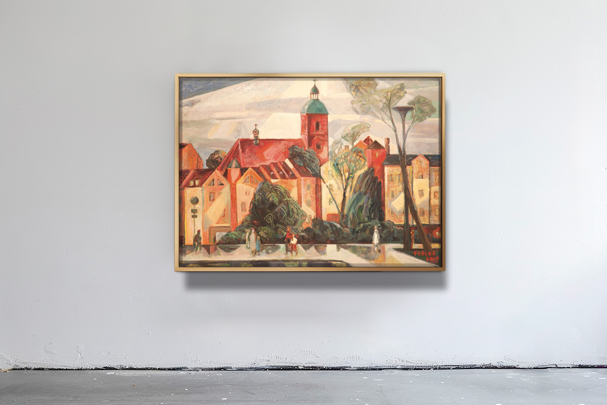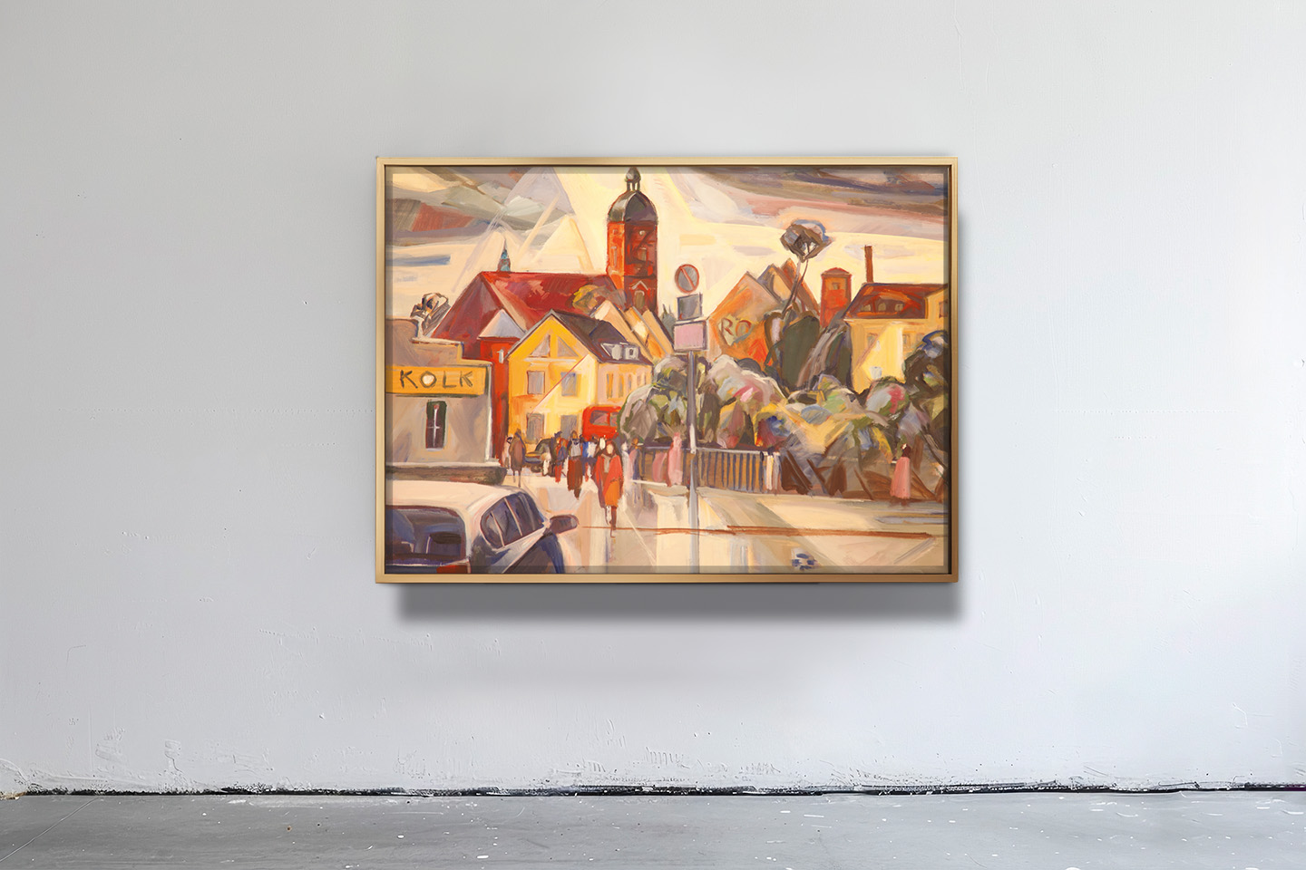 Gemälde „Nikolaikirche“ von Helmut Frelke, ruhige Berliner Straßenszene, Spandau 2017